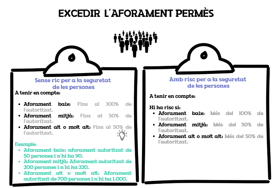 - S'excedeixi l'aforament autoritzat en un 50% en els establiments d'aforament mitjà, alt i molt alt i en un 100% en els establiments de baix aforament autoritzat.