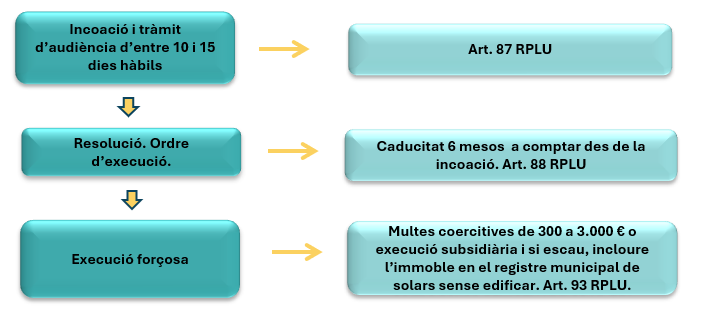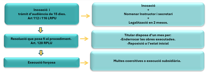 Quan a la inspecció detectem unes obres en curs sense llicència o comunicat o no ajustades a aquests, hem d'obrir un procediment d'ordre d'execució d'acord amb el següent esquema de l'article 205 de la Llei d'urbanisme.