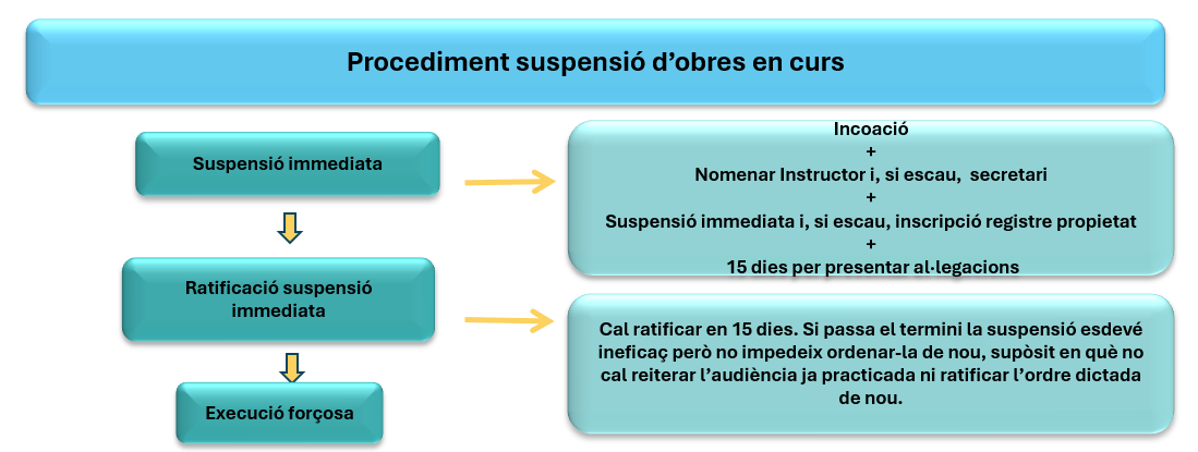 Quan la resolució d’iniciació del procediment faci referència a obres en curs d’execució, l’òrgan competent ha d’ordenar la suspensió immediata de les obres com a mesura provisional mentre no finalitzi el procediment o, si s’escau, no es legalitzi l’acte de què es tracti (art. 118 del RPLU).