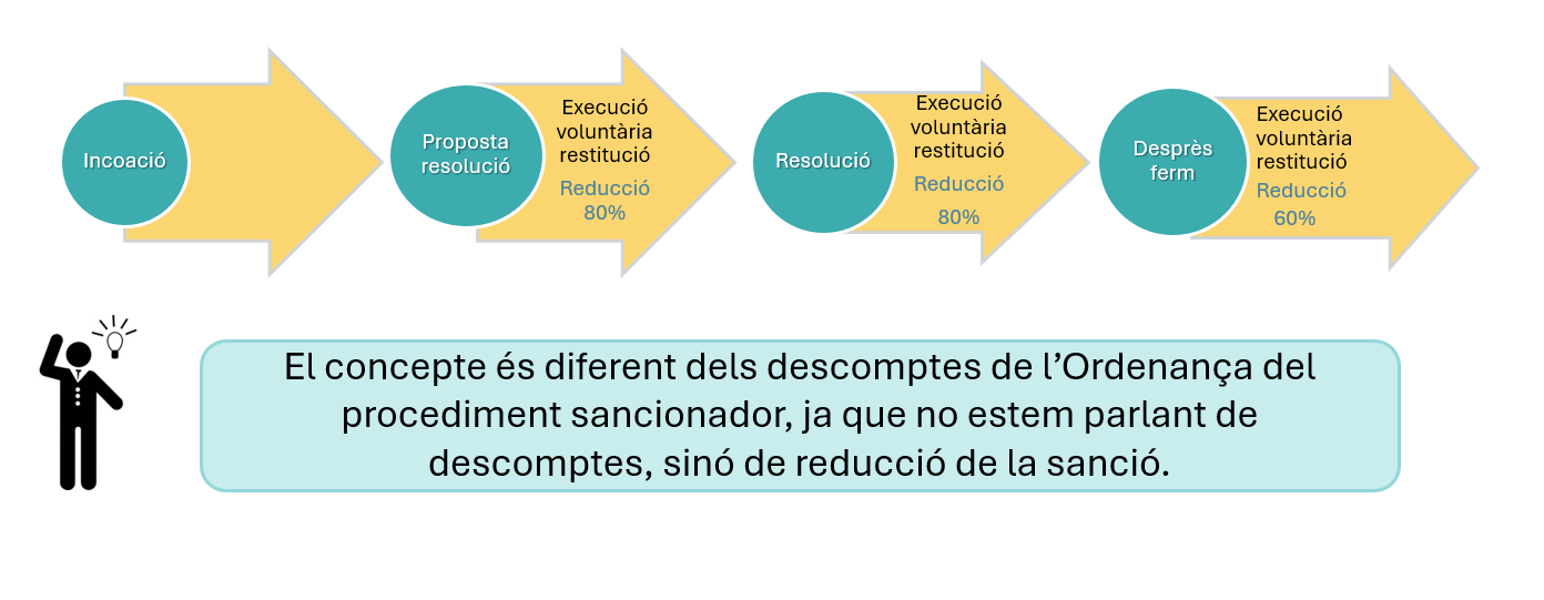 Segons l'article 142 del RPLU, cal reduir l’import de la multa un 80% si l’interessat executa voluntàriament l’ordre de restitució i, si s’escau, paga voluntàriament la indemnització dels danys causats abans que la sanció sigui ferma. Així mateix, d’acord amb l'article 142.1 del RPLU, cal reduir l’import de la multa un 60% si l’interessat executa voluntàriament l’ordre de restitució i, si s’escau, paga voluntàriament la indemnització dels danys causats després que la sanció sigui ferma, però abans que es dicti una ordre d’execució forçosa. Si la restauració i la indemnització són parcials, cal fer una reducció de la multa en proporció a aquestes. Les reduccions s’han d’aplicar a petició de l’interessat, però també es poden donar d’ofici si es comprova que l’interessat ha executat les mesures voluntàriament.