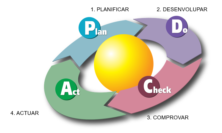 La millora contínua es reflecteix en el cicle de Deming, també conegut com cicle PDCA (de l'anglès plan-do-check-act, que hem traduït per 'planificar', 'desenvolupar', 'comprovar' i 'actuar').