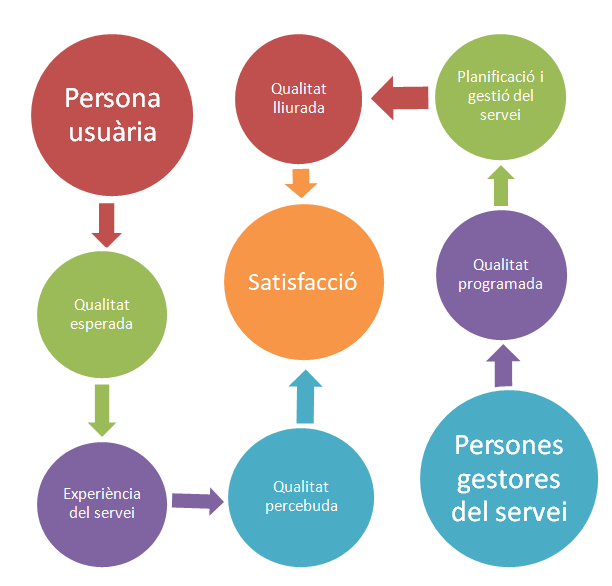 A la imatge anterior es relaciona, de manera molt esquemàtica, la qualitat d'un servei amb els actors implicats (persona usuària i prestadors dels serveis). Al centre de la imatge, la satisfacció amb el servei, que té lloc quan el nivell de qualitat percebuda per la persona usuària coincideix amb el nivell de qualitat lliurada pels prestadors dels serveis.