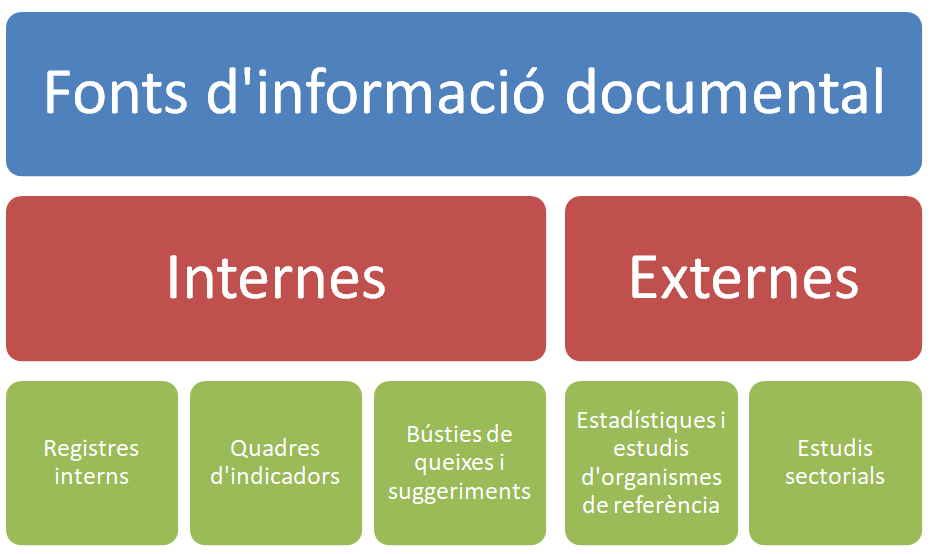 - Fonts d'informació interna són, per exemple, registres interns, quadres d’indicadors, etc., que hi pugui haver. Molt importants són les bústies de queixes i suggeriments, ja que constitueixen una de les vies més directes per conèixer les necessitats i expectatives de les persones usuàries dels serveis.