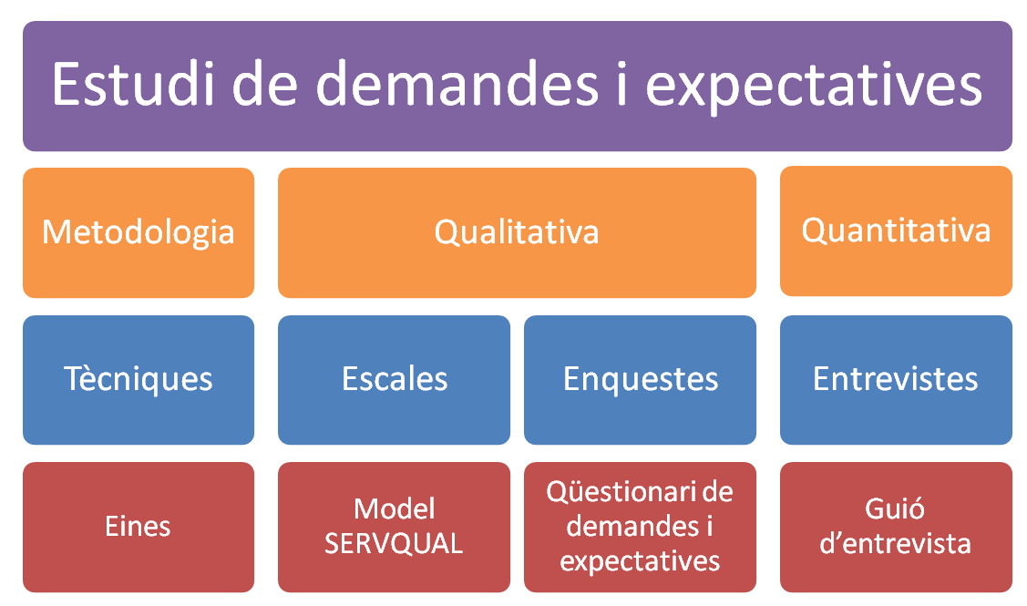 A continuació es fa un resum de les tècniques i les eines més emprades en l'estudi de demandes i expectatives de les persones usuàries, classificades per tipus de metodologia de recerca.