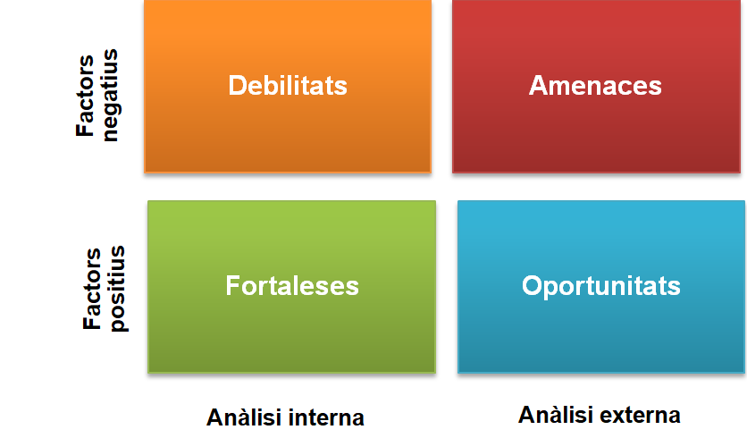 - Les oportunitats i les amenaces (es tracta de l’anàlisi externa, respecte als principals factors de l’entorn de la situació).