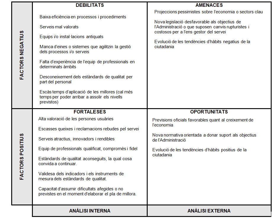 - Els punts forts i les àrees susceptibles de millora (es tracta de l’anàlisi interna i els aspectes intrínsecs o sota la influència de l’organització).